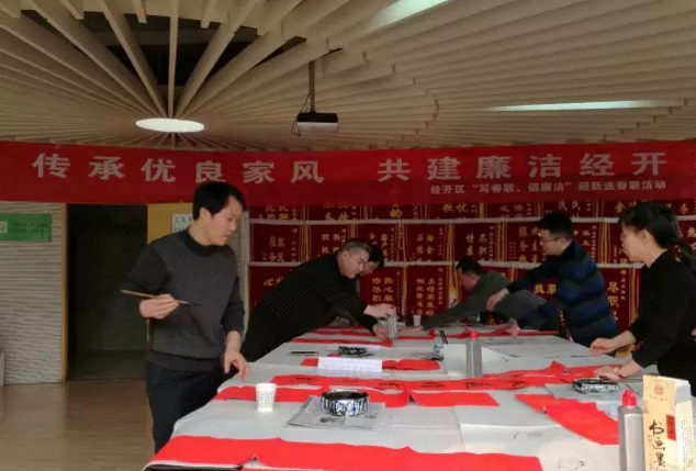 在中国传统节日“春节”即将来临之际,为进一步推进“廉洁经开”建设,传承优良家风,积极创新反腐教育形式。经开区党工委、管委会、纪工委联合在全区开展以“传承优良家风 共建廉洁经开”为主题的“迎新春、写春联、倡廉洁”送祝福活动。邀请陕西省青年书法家协会梁林波、王江、杨小琪等著名书法家和区内书法爱好者为全区广大群众和企业职工现场创作书写家规家训春联。